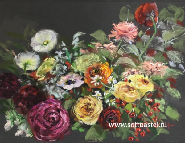 In de kerstvakantie heb ik een aantal weken pastel geschilderd, dit is er een van Bloemen op een donkere achtergrond.